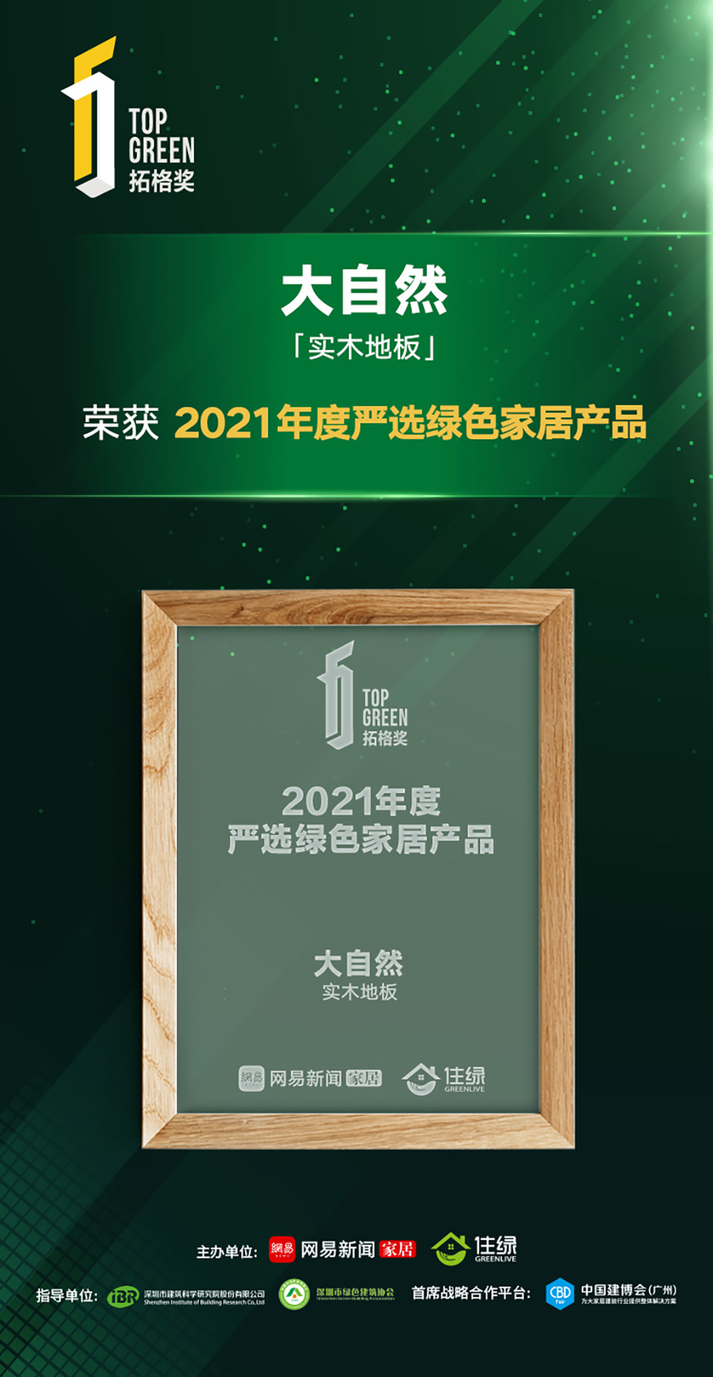 2022年1月15日,“嚴選好家 向好生活提案——2021網(wǎng)易中國家居冠軍榜暨拓格獎頒獎盛典”在線上隆重舉行,家居領(lǐng)袖齊聚云端,共襄行業(yè)年度盛宴。大自然家居憑借實力獲得“2021年度中國家居冠軍榜行業(yè)領(lǐng)軍品牌”和“2021年度綠色環(huán)保先鋒品牌”兩大獎項,大自然實木地板榮獲“2021年度嚴選綠色家居產(chǎn)品”。